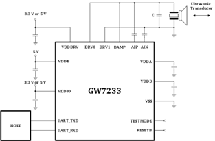 The GW7233 is a device that combines an integrated microcontroller and an analog front end to provide ultrasonic range detection using a minimal number of components. Its pulse-width modulation (PWM) outputs allow for programmable bursts to be sent to a single ultrasonic transducer. With the support of compatible transducers, this device allows for distance measurement and can be utilized for presence detection without any external components.