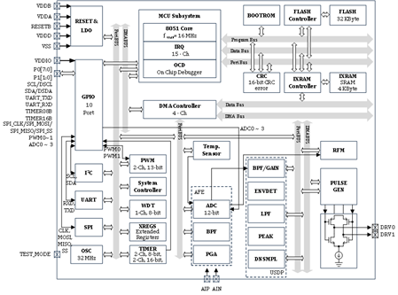 The device includes a 32 KB embedded Flash memory for storing application-specific programs and data, while a 4 KB SRAM is available for storing data required for signal processing purposes.