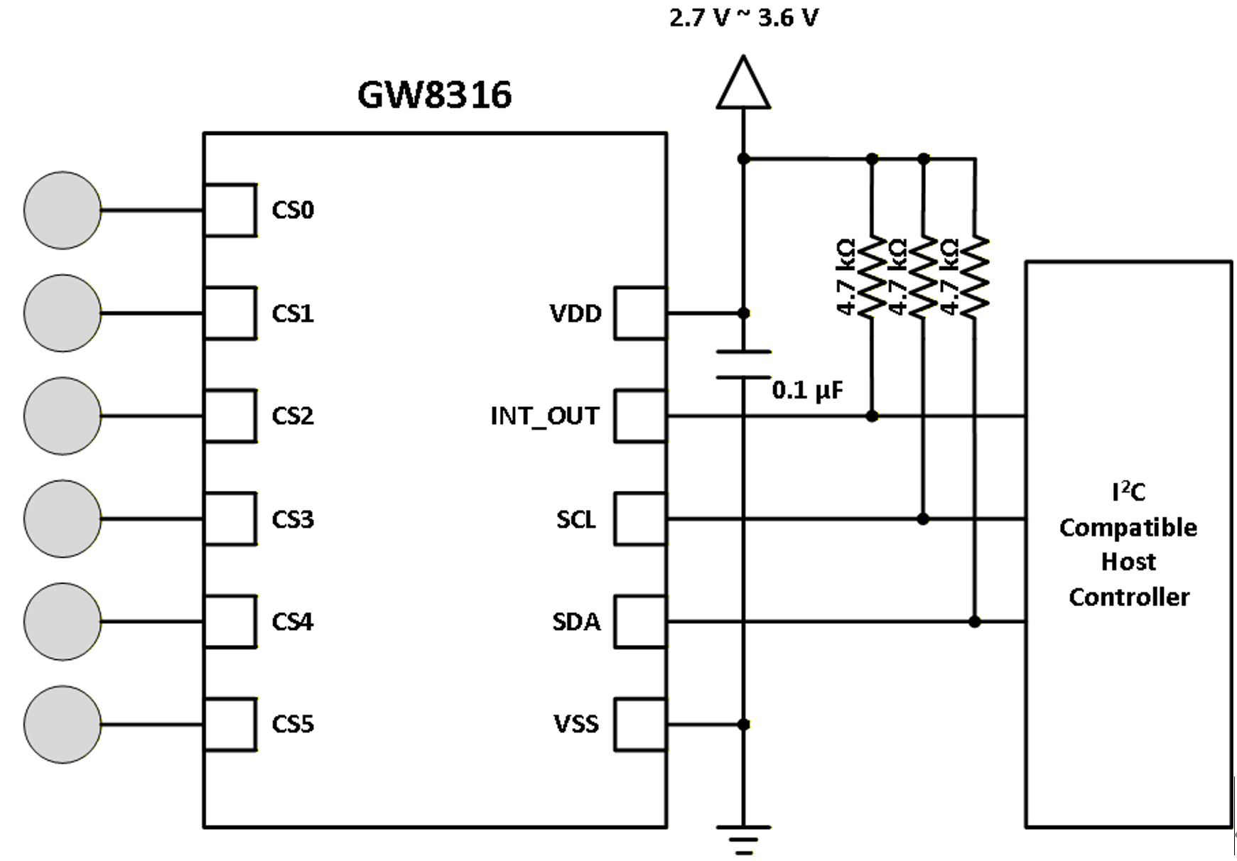 The GW8316 communicates to a host over the Inter-Integrated Circuit(I2C) serial bus, which can solely operate even in sleep mode. The Host can wake up the device from sleep mode with an I2C command. The interrupt signal output can be activated to allow the host to get the relative proximity distance or to receive a detection notification in an efficient way.