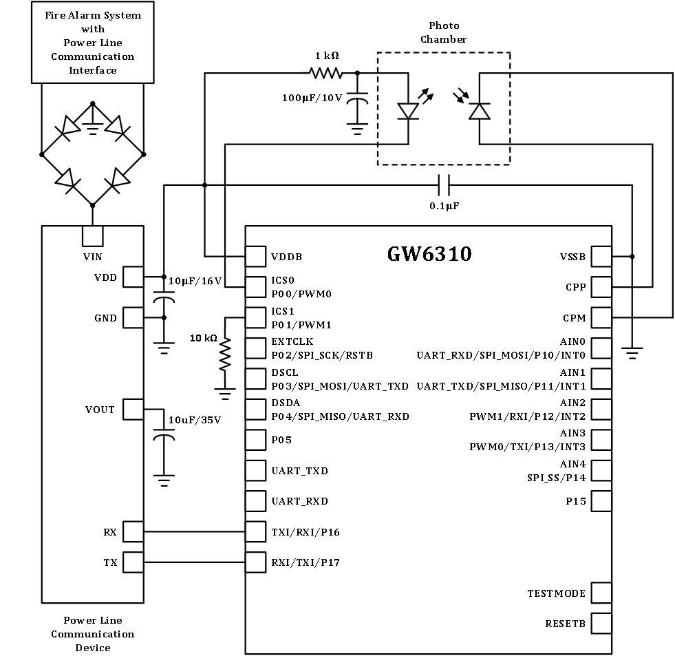 The GW6310 is a highly flexible smoke detector IC with accurate smoke sensing AFE and long battery life power management circuit. GW6310 integrates 8051 compatible processor and peripherals for photoelectric smoke alarm, low power management, and communication. It includes accurate transimpedance amplifier (TIA), programmable gain amplifier (PGA), 12-bit ADC, LDOs for internal logic circuitry and MCU with IDLE, SLEEP, and RUN mode supported, highly reliable LED driver, two general purpose pulse width modulators (PWM), Power Line Communication (PLC) I/F, serial interfaces, and general purpose I/Os.